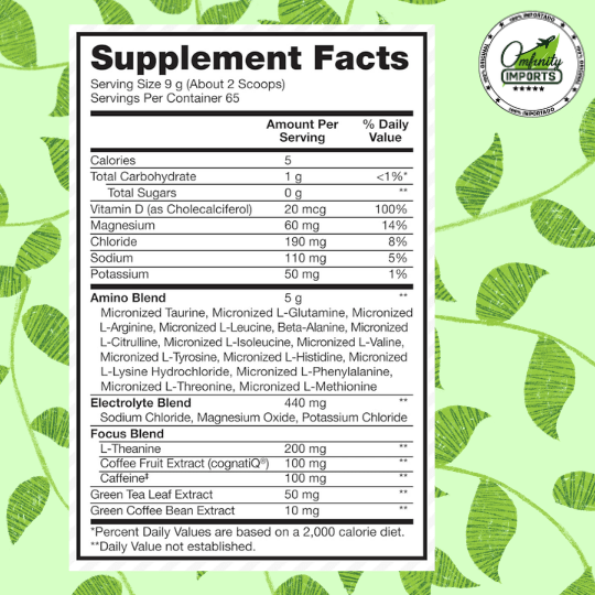 - Matriz de Energía: 100 mg de cafeína de origen natural por cada 2 cucharadas (scoops).