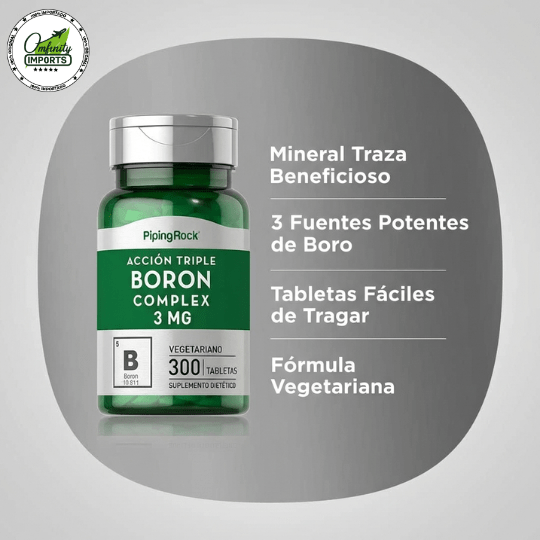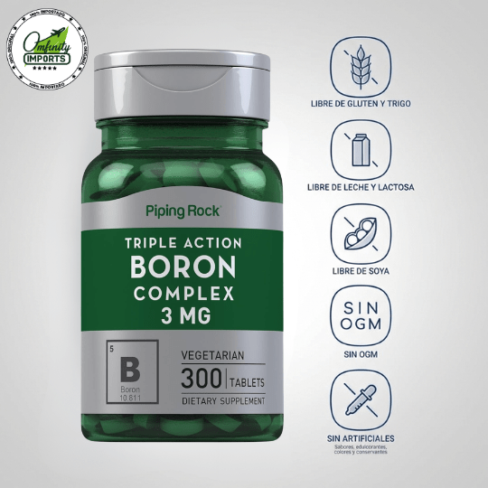 - Boro (Complejo de Citrato, Glicinato y Aspartato): 3 mg por tableta.
