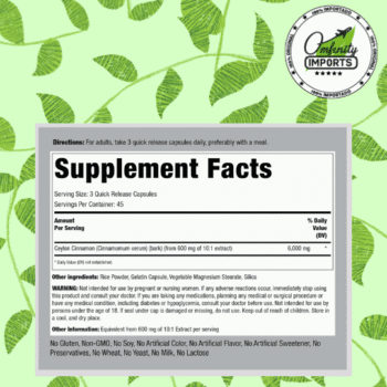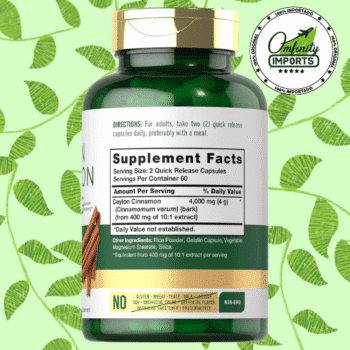 - Canela Real (Ceylon): A diferencia de la canela común (Cassia), esta fórmula utiliza Cinnamomum verum, conocida como la “canela verdadera”, con menores niveles de cumarina.