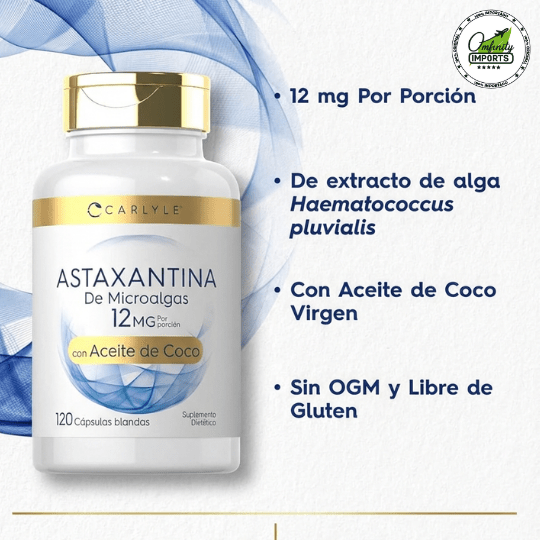 Frasco con 120 cápsulas blandas de liberación rápida. Cada porción contiene 12 mg de Astaxantina pura, extraída de microalgas (Haematococcus Pluvialis)