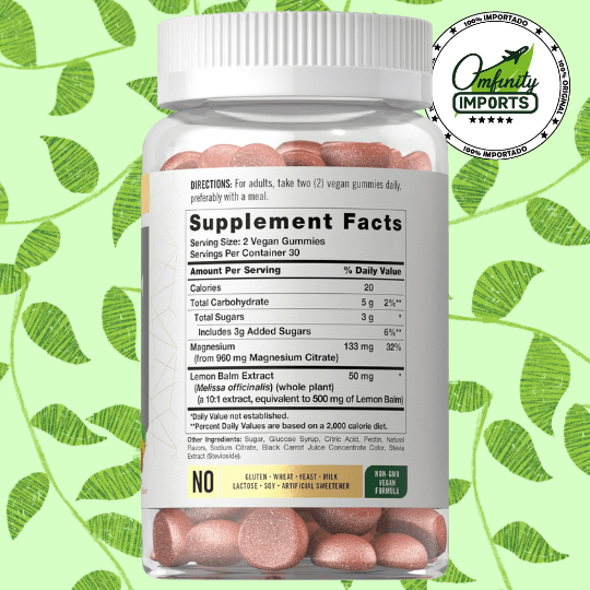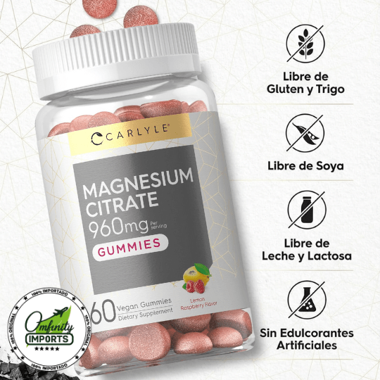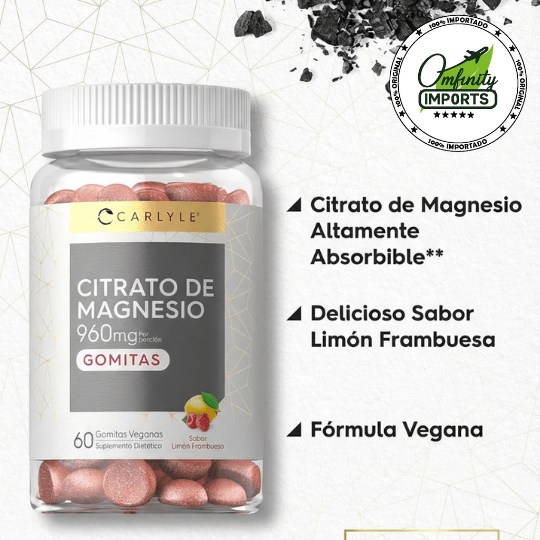 Frasco con 60 gomitas masticables. 960 mg de Citrato de Magnesio por porción. Sabor natural a limón y frambuesa.