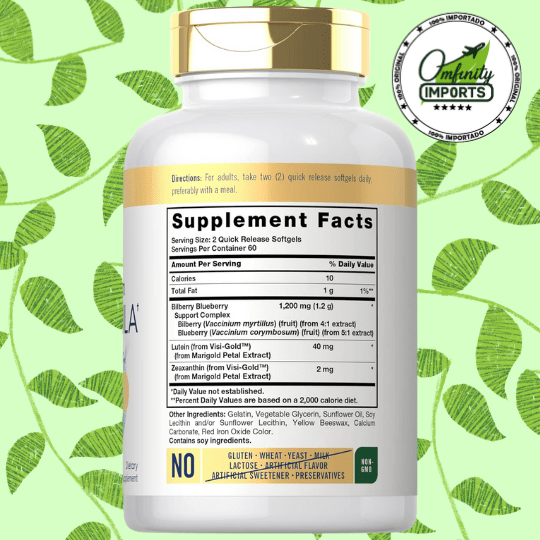 120 cápsulas blandas (softgels) por envase. Contiene 40 mg de Luteína, Zeaxantina, Arándano y Mirtilo.