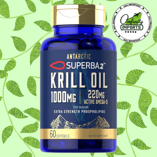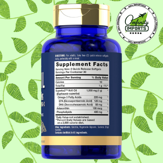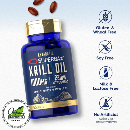 60 cápsulas blandas de liberación rápida, 1000 mg de aceite de krill Superba2™ por porción (2 cápsulas), 220 mg de Omega-3 por porción, 120 mg de EPA (ácido eicosapentaenoico) y 55 mg de DHA (ácido docosahexaenoico) por porción, 100 mcg de Astaxantina, 400 mg de fosfolípidos por porción.