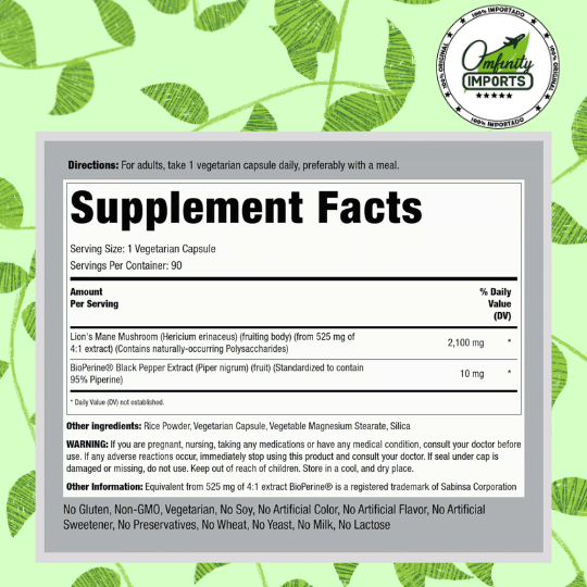 - Ingredientes Hongo Melena de León (cuerpo fructífero) (de 525 mg de extracto 4:1) y Extracto de Pimienta Negra BioPerine®.