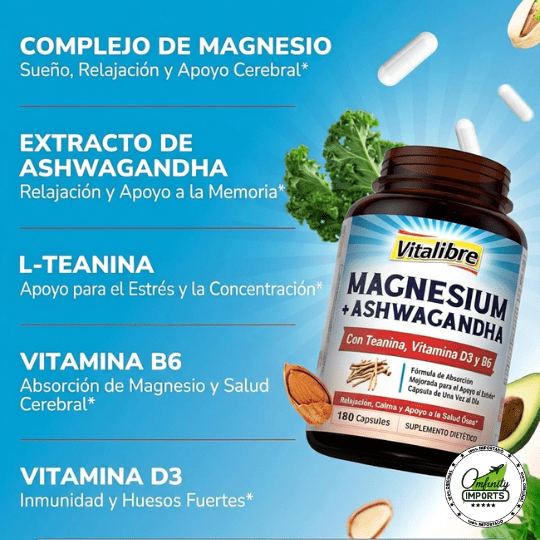 Ingredientes Citrato de Magnesio (o bisglicinato, según fórmula) y Extracto de raíz de Ashwagandha (Withania somnifera).