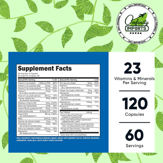 - Ingredientes Vitaminas (A, C, D3, E, K1, B-Complex), Minerales (Zinc, Magnesio, Selenio, Cobre, Manganeso, Cromo) y Mezclas de soporte masculino. Otros ingredientes: Cápsula de gelatina, harina de arroz.