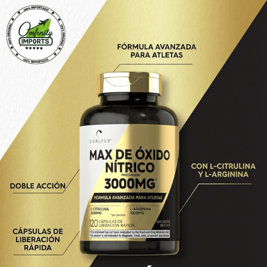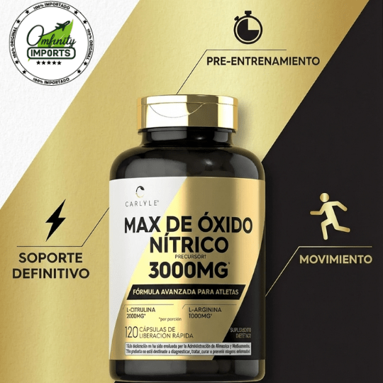 🗸Lleva tu entrenamiento al siguiente nivel con el Óxido Nítrico MAX de Carlyle. Diseñado para atletas, te ayuda a maximizar tu rendimiento y a lograr ese «pump» que tanto buscas. Prepárate para entrenar más fuerte y por más tiempo.