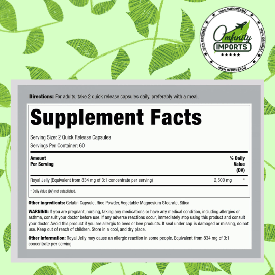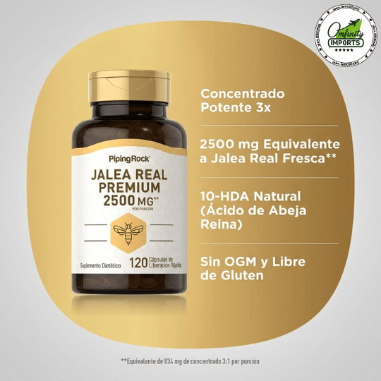- Potencia Concentrada: Cada servicio aporta el equivalente a 2500 mg de Jalea Real fresca, derivada de un concentrado 3:1 altamente nutritivo.