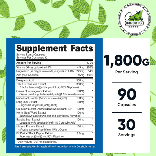 • Ingredientes D-Aspartic Acid, Tribulus Terrestris, Fenogreco, Zinc, Magnesio, Vitamina B6 y Vitamina D. Otros ingredientes: Cápsula de gelatina, estearato de magnesio.