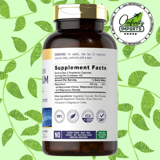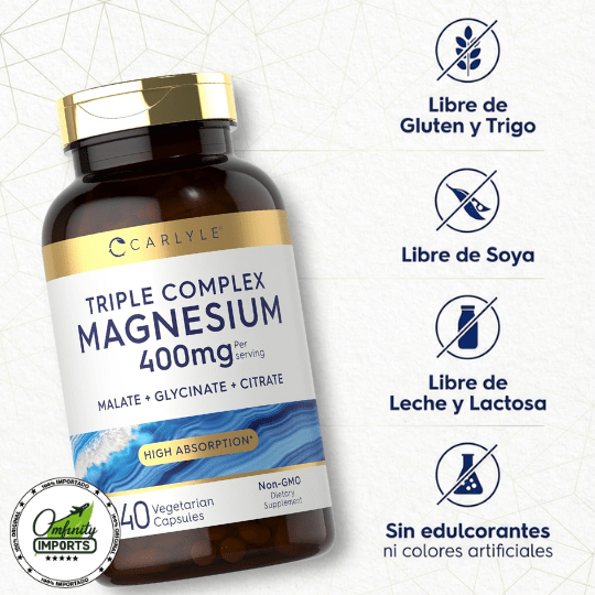 • Complejo de Alta Absorción: Combina tres formas clave de magnesio (Citrato, Glicinato y Malato) para maximizar la biodisponibilidad y eficacia en comparación con el óxido de magnesio tradicional.
